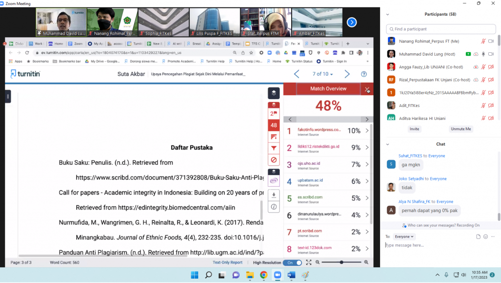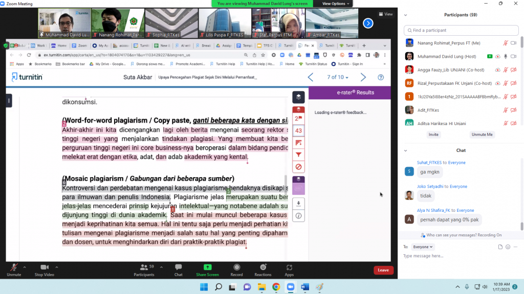 Perpustakaan Pusat Universitas Jenderal Achmad Yani (UNJANI) menyelenggarakan Webinar internal dengan tema “Penyegaran instruktur Turnitin Feedback Studio (OC)”, diselenggarakan pada hari Selasa, 17 Januari 2023, pukul: 08.45 s/d Selesai, melalui Zoom Meeting. Kegiatan Pelatihan ini bertujuan sebagai Refreshing Training dalam rangka mengoptimalisasikan pemanfaatan tools Turnitin khususnya Feedback Studio untuk mengecek kemiripan teks karya ilmiah mahasiswa dan dosen dilingkungan Universitas Jenderal Achmad Yani (UNJANI). Kegiatan Pelatihan ini diisi oleh Narasumber Bapak Muhammad David Lung (Senior Professional & Education Consultant Turnitin Indonesia) yang merupakan pakar di bidang Turnitin. Kegiatan Pelatihan ini diikuti 58 orang peserta yang terdiri dari pustakawan dan perwakilan dosen setiap prodi dilingkungan Universitas Jenderal Achmad Yani (UNJANI).