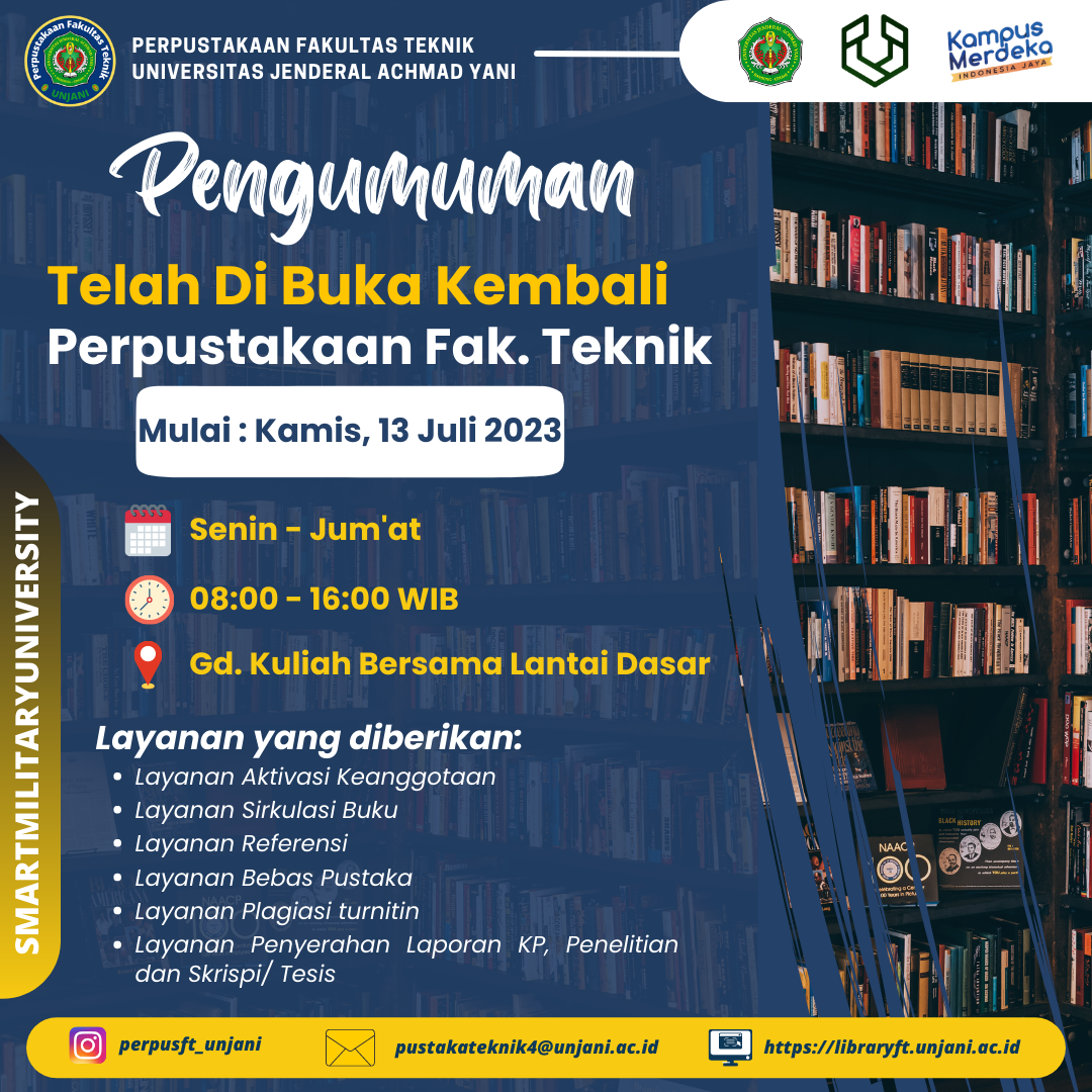 Perpustakaan Fakultas Teknik UNJANI, kembali beroprasi Mulai pada Hari Kamis, 13 Juli 2023