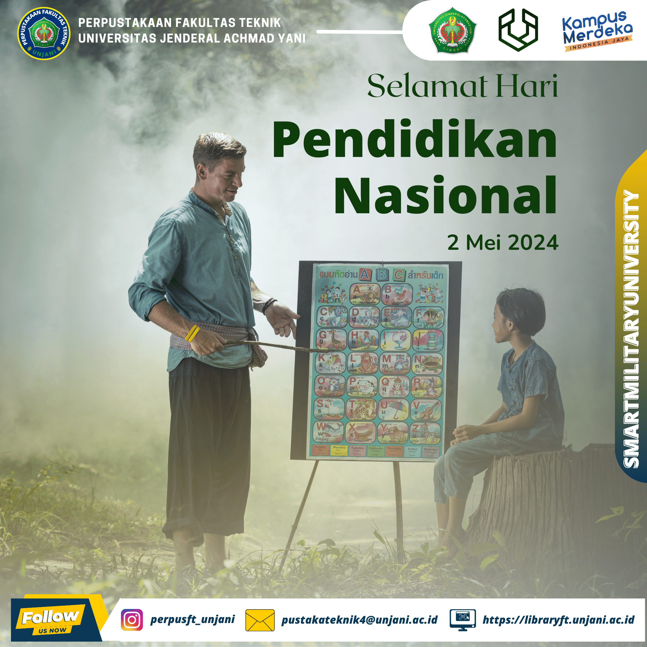 Di Hari Pendidikan Nasional ini, mari kita merayakan keberhasilan dan menghargai peran penting para pendidik serta tenaga kependidikan dalam membentuk karakter dan membuka pintu kesempatan bagi generasi masa depan. Perpustakaan Fakultas Teknik Unjani dengan bangga mengucapkan selamat kepada seluruh komunitas pendidikan, dari guru-guru yang gigih mengajar di kelas hingga staf administrasi yang bekerja di belakang layar untuk mendukung proses belajar-mengajar.