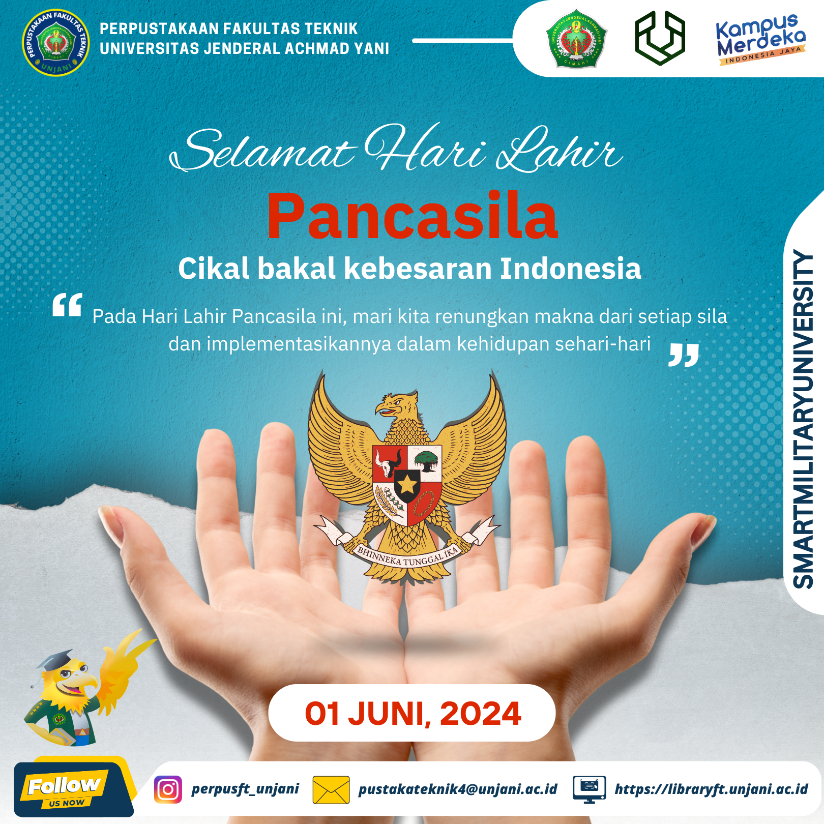 Sebagai bagian dari komunitas akademik, Perpustakaan Fakultas Teknik Universitas Jenderal Achmad Yani mengajak seluruh mahasiswa, dosen, dan staf untuk memperkokoh nilai-nilai Pancasila dalam setiap aspek kehidupan. Melalui pendidikan dan literasi, kita dapat menanamkan nilai-nilai Pancasila kepada generasi muda dan membangun masa depan Indonesia yang lebih baik. Perpustakaan Fakultas Teknik berkomitmen untuk terus mendukung kegiatan akademik yang mengedepankan nilai-nilai luhur Pancasila.