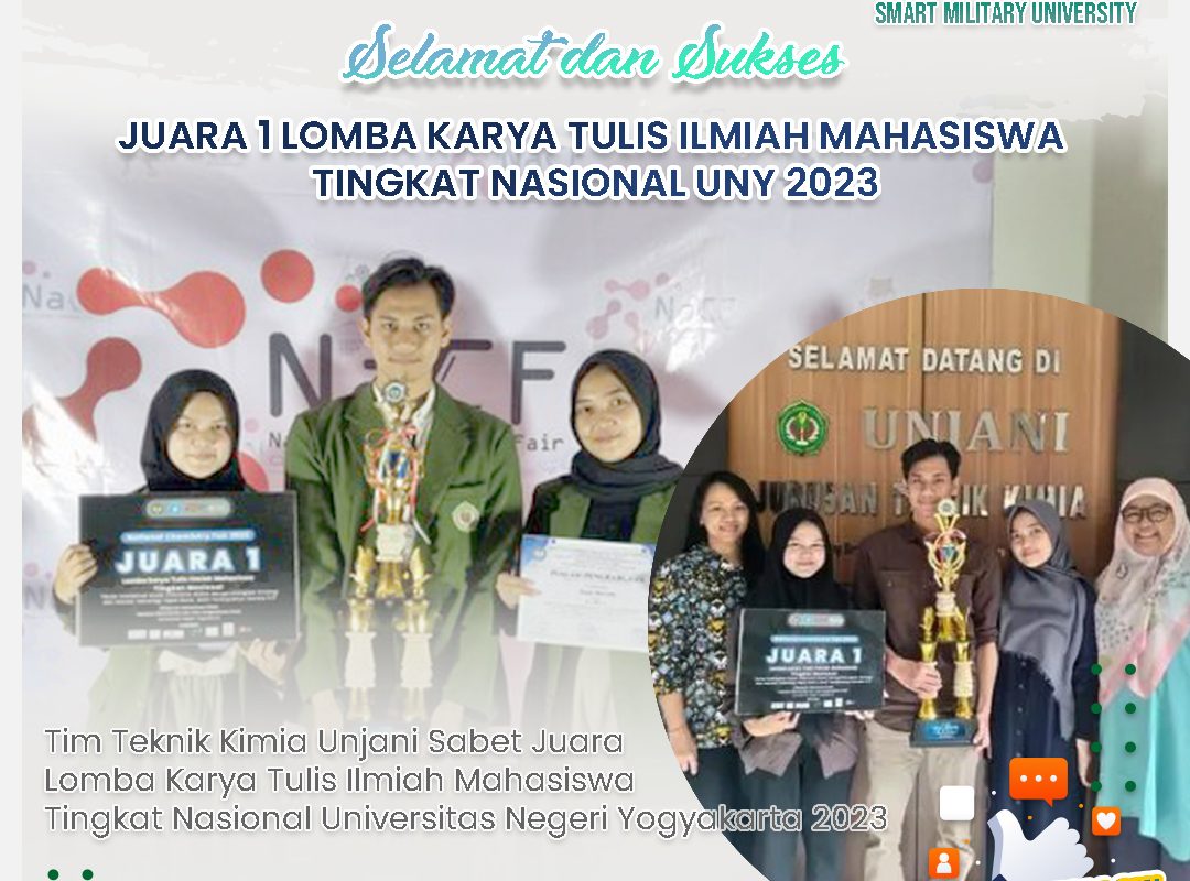 Selamat kepada Mahasiswi Teknik Kimia Fakultas Teknik Univ. Jenderal Achmad Yani atas raihan prestasi: Juara 1 Lomba Karya Tulis Ilmiah Tingkat Nasional “Peran Intelektual Muda Indonesia dalam Mengembangkan Strategi dan Inovasi Teknologi Tepat Guna demi Terwujudnya Society 5.0”