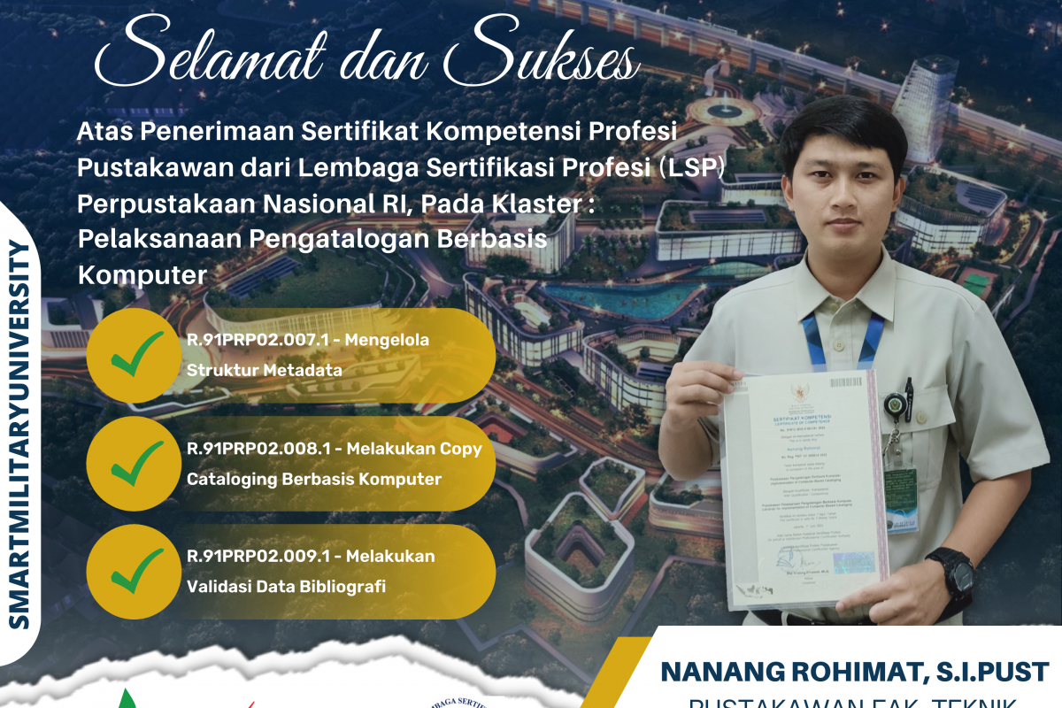 Alhamdulillah, Selamat dan Sukses kepada Bpk. Nanang Rohimat, S.I.Pust Pustakawan Fakultas Teknik UNJANI yang telah mendapatkan sertifikat kompetensi yang dikeluarkan oleh Lembaga Sertifikasi Pustakawan (LSP) Perpustakaan Nasional (Perpusnas) RI (per 2022).