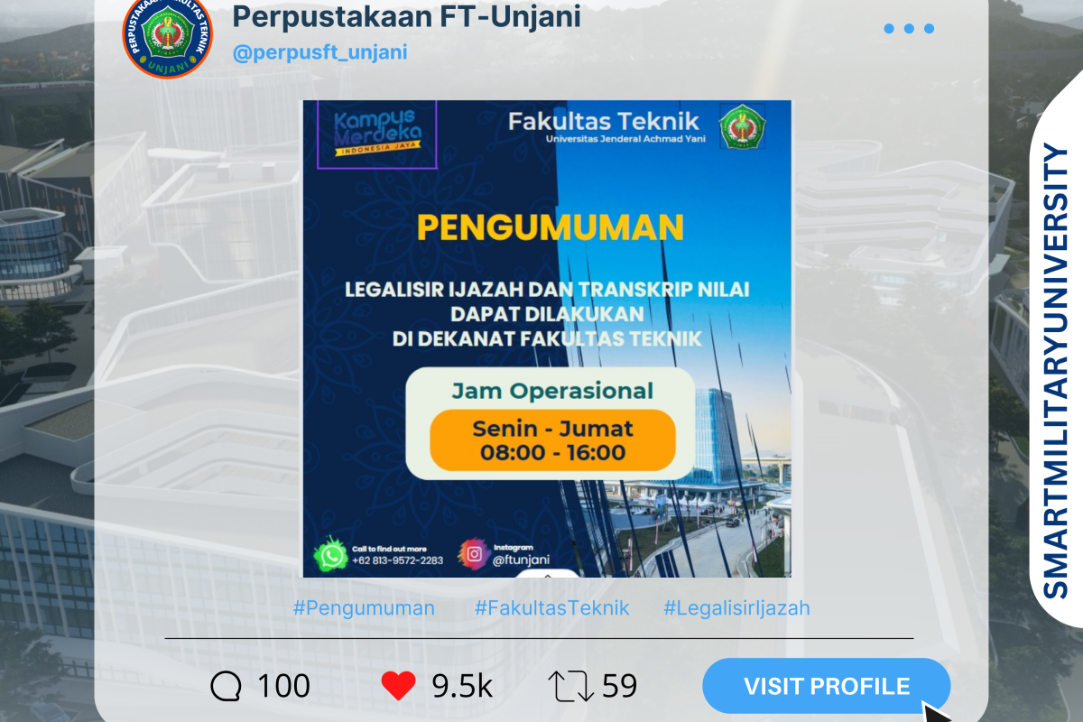 Layanan Legalisir Ijazah dan Transkrip Nilai Fakultas Teknik UNJANI dapat dilakukan di gedung dekanat Fakultas Teknik. Layanan ini tersedia setiap hari Senin s/d Jum’at mulai pukul 08:00 hingga 16:00 WIB.