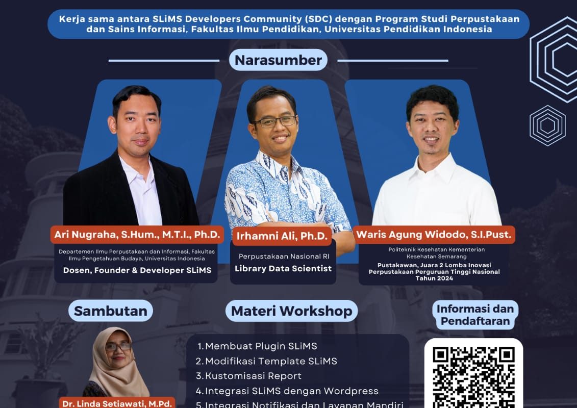 Setelah terakhir kali digelar pada tahun 2019 di Lampung, SLiMS Commeet hadir kembali dengan kegiatan Seminar Nasional dan Workshop yang akan dilaksanakan di Bandung. SLiMS Commeet 2024 kali ini merupakan kegiatan kerja sama antara SLiMS Developers Community (SDC) dengan Program Studi Perpustakaan dan Sains Informasi (PSPI) Universitas Pendidikan Indonesia.