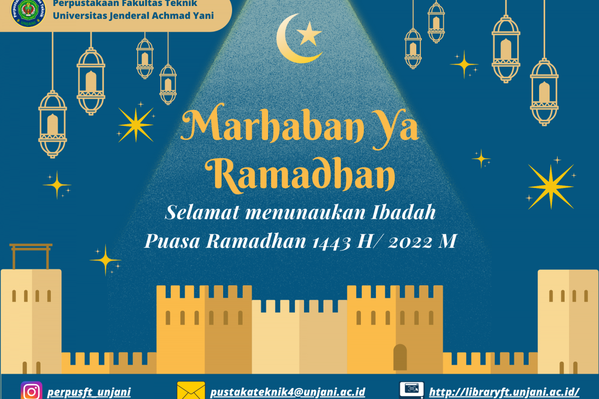 Kami Segenap Keluarga Perpustakaan Fakultas Teknik Mengucapkan “Selamat Menunaikan Ibadah Puasa Ramadhan 1443 H/ 2022 M”. Marhaban Ya Ramadhan, Mari Kita Sucikan & Terangi Hati dengan Amal Ibadah.