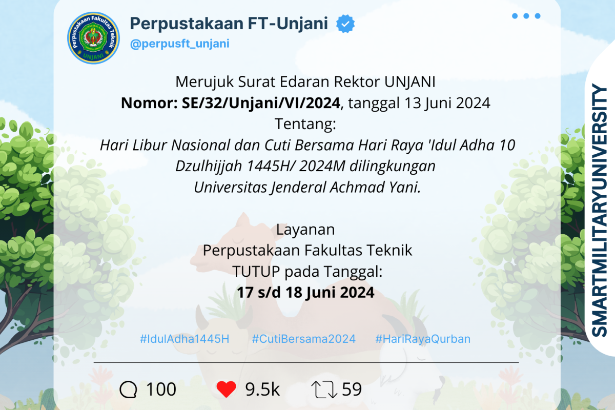 Dalam semangat Hari Raya Idul Adha 1445 H/ 2024 M, Perpustakaan Fakultas Teknik UNJANI mengucapkan selamat Hari Raya Idul Adha kepada seluruh civitas akademika Universitas Jenderal Achmad Yani.