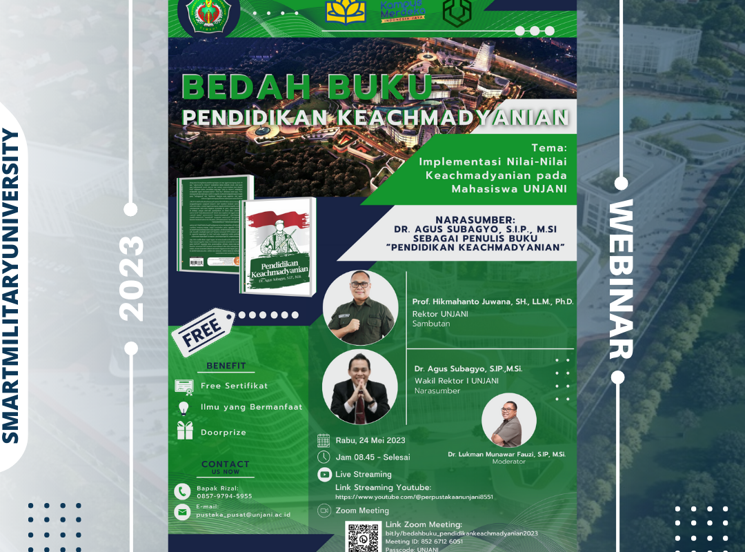 Perpustakaan Universitas Jenderal Achmad Yani. Mengadakan acara webinar Bedah Buku dengan tema Implementasi Nilai-nilai Keachmadyanian pada Mahasiswa UNJANI. Acara tersebut diselenggarakan pada Rabu, 24 Mei 2023, pukul 08.30 – 12.00 WIB.