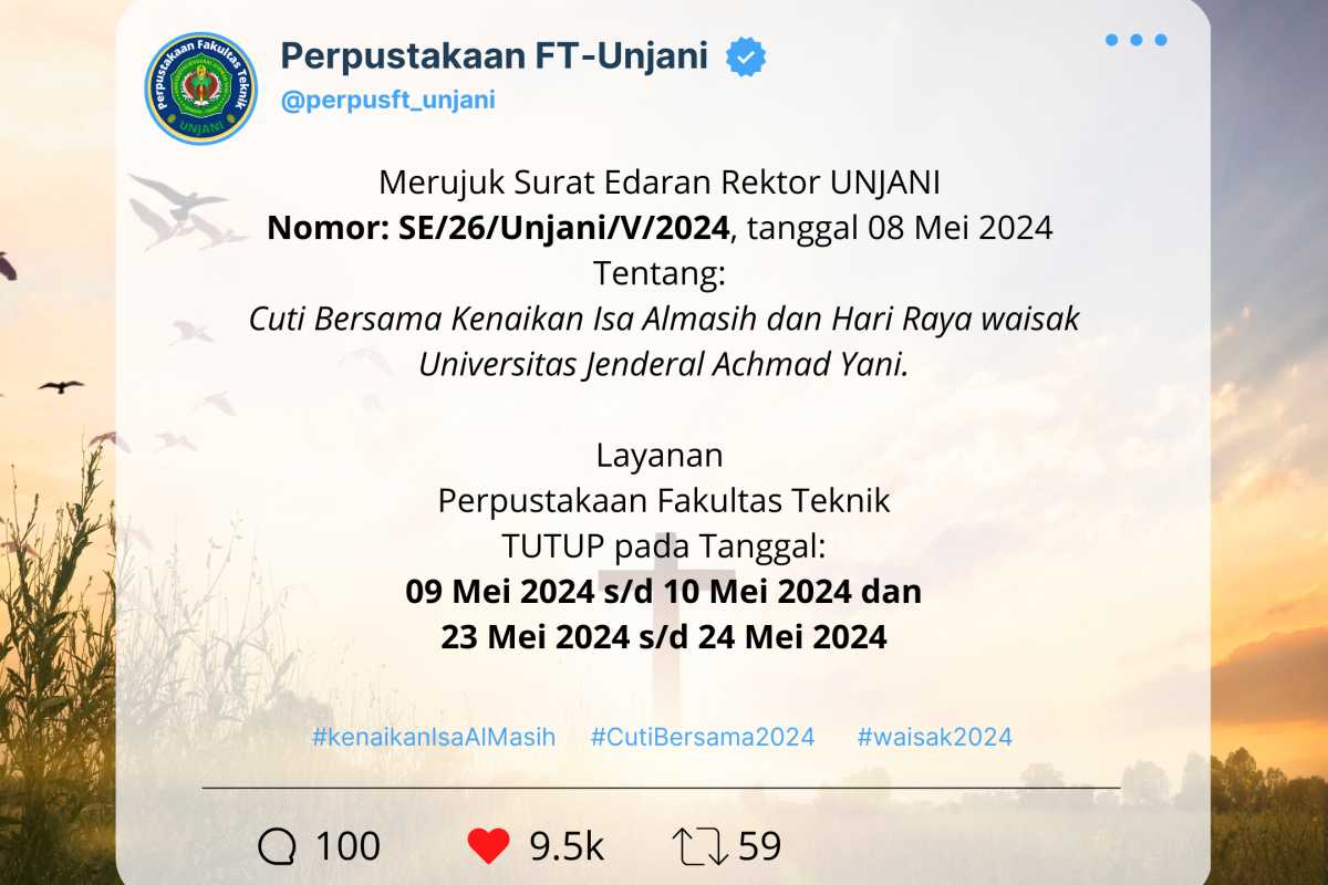 Merujuk Surat Edaran Rektor UNJANI Nomor: SE/26/Unjani/V/2024, tanggal 08 Mei 2024 Tentang Cuti Bersama Kenaikan Isa Almasih dan Hari Raya Waisak 2024 dilingkungan Universitas Jenderal Achmad Yani.